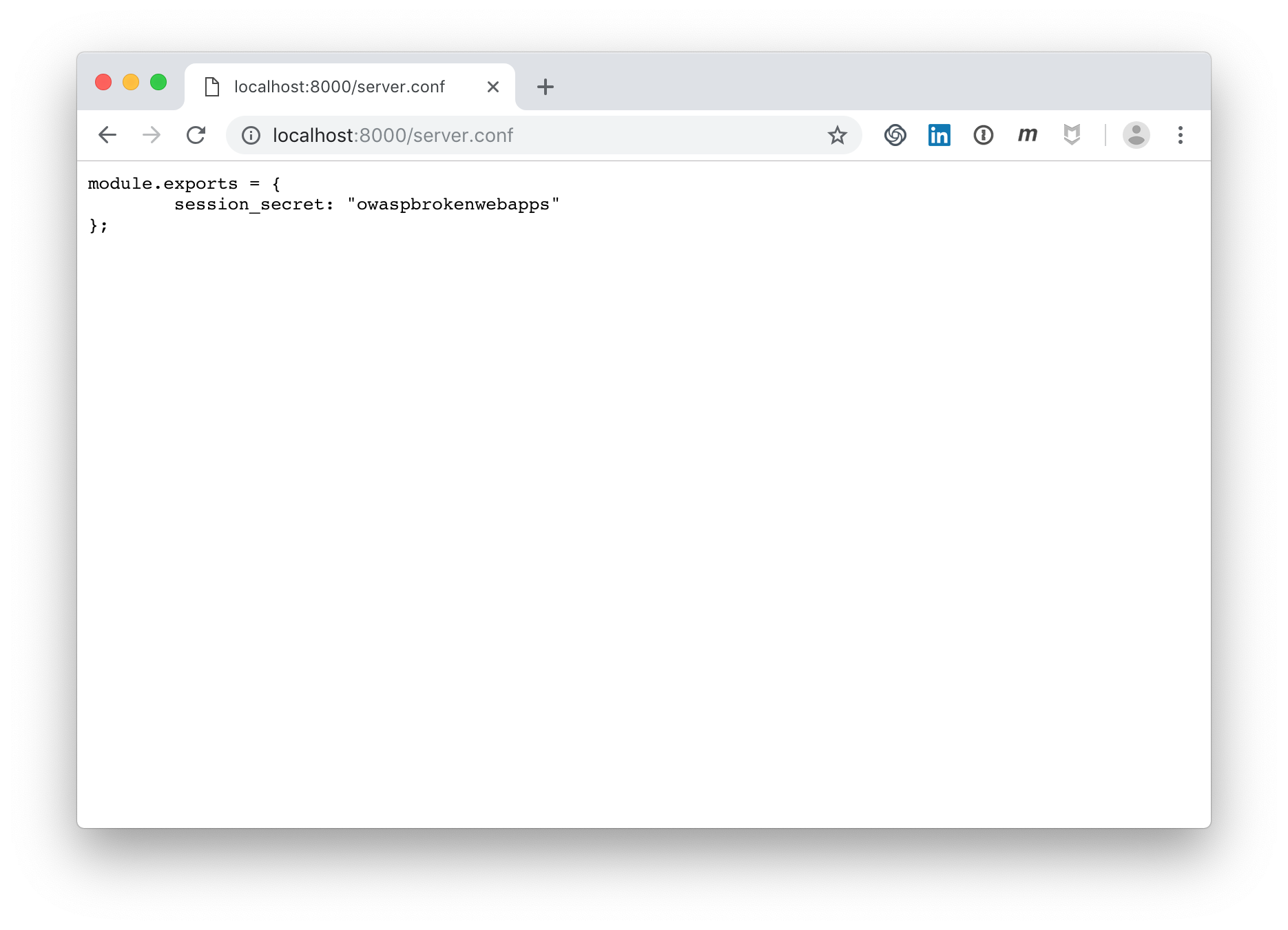Another misbehaviour of the application is that the secret key is stored in a publicly accessible server.conf file:
